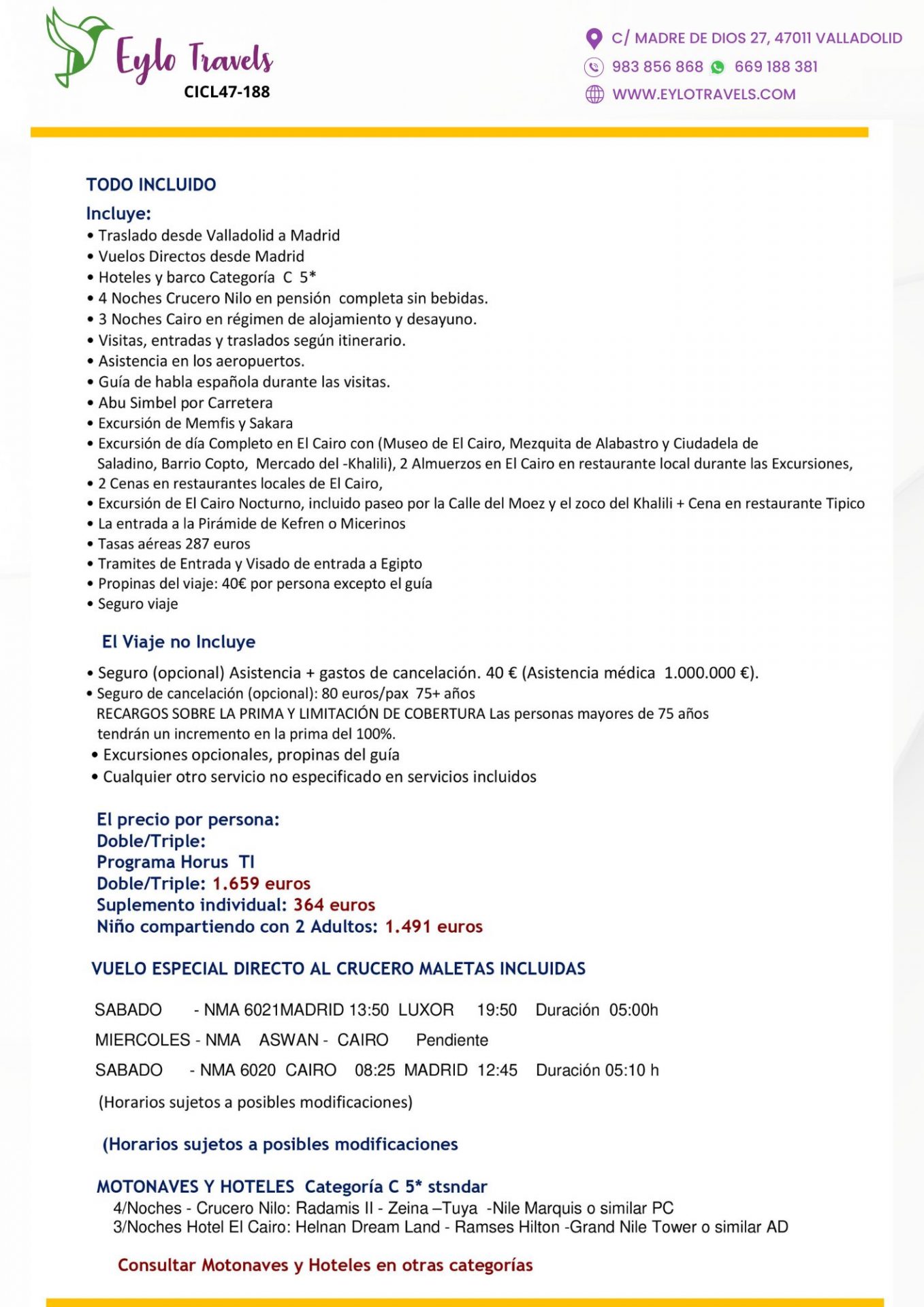 - Crucero: 4 Noches a bordo de un motonave/hotel Categoría 5* Estándar (como el Radamis II o similar), en régimen de Pensión Completa Sin Bebidas.