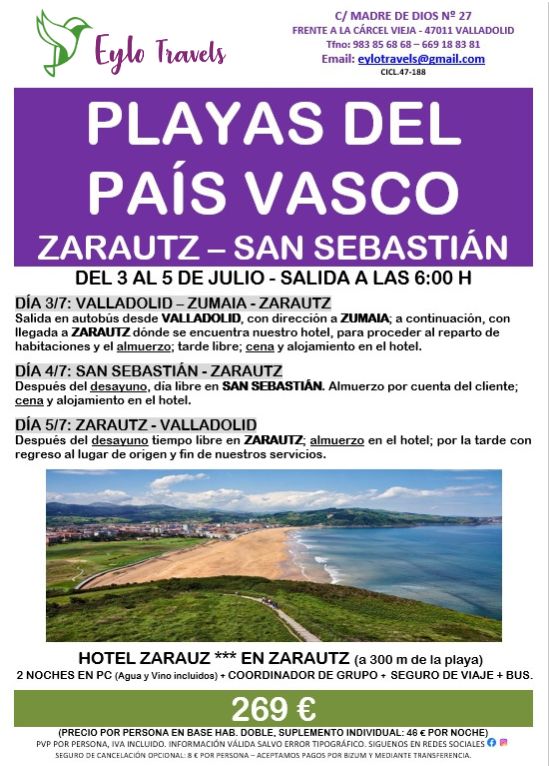 Disfrute de una inolvidable escapada de 3 días a dos de las joyas de la costa vasca: Zarautz y San Sebastián. Un viaje organizado por Eylo Travels que combina el encanto surfista de Zarautz, con su espectacular playa, y la elegancia cosmopolita de San Sebastián, capital gastronómica mundial. Salida desde Valladolid.