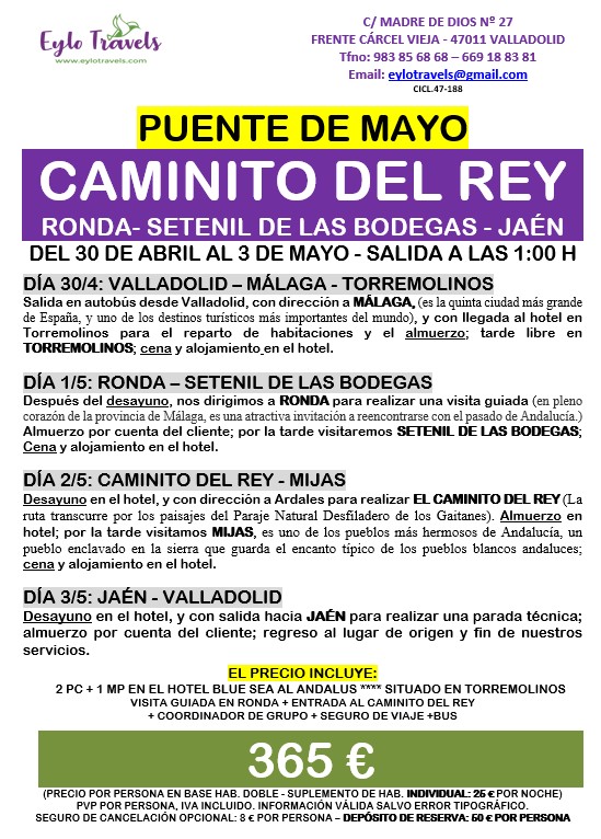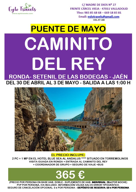 Salida desde Valladolid en autobús hacia la Costa del Sol. Llegada a Málaga, la quinta ciudad más grande de España, y posterior traslado a Torremolinos. Alojamiento en el Hotel Blue Sea Al Andalus** reparto de habitaciones y almuerzo. Tarde libre para disfrutar de la playa, pasear por el paseo marítimo o explorar el ambiente de la Costa del Sol. Cena y alojamiento en el hotel. - 01/05/2026 – Ronda – Setenil de las Bodegas