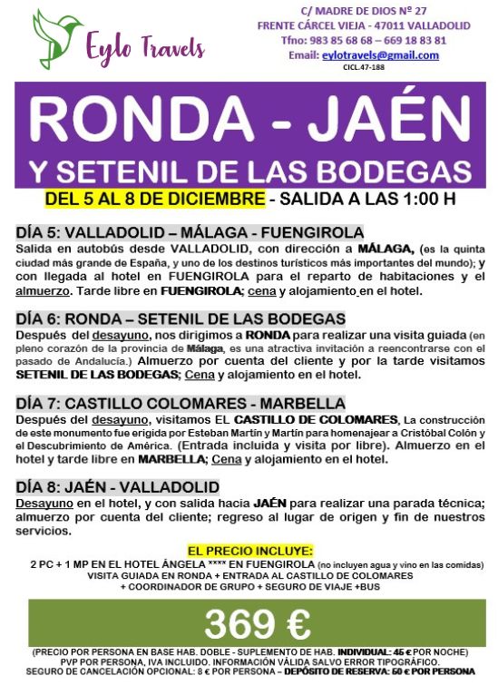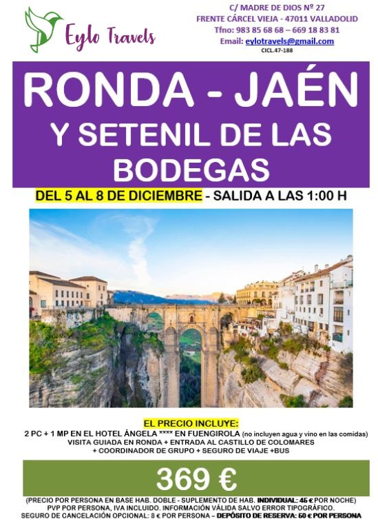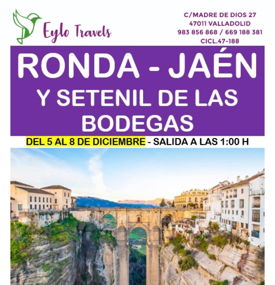 Salida desde Valladolid con destino a Málaga la quinta ciudad mas grande de España y destino turístico importante a nivel mundial y con llegada al hotel en Fuengirola. Reparto de habitaciones y almuerzo. Tarde libre en Fuengirola, cena y alojamiento en hotel. - 06/12/2025: Ronda – Setenil de las Bodegas