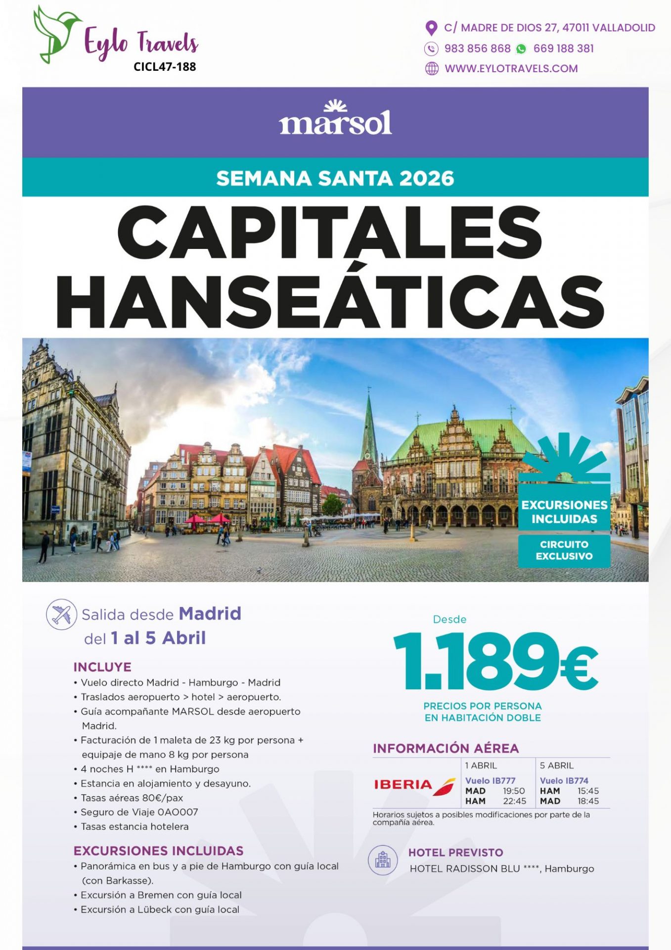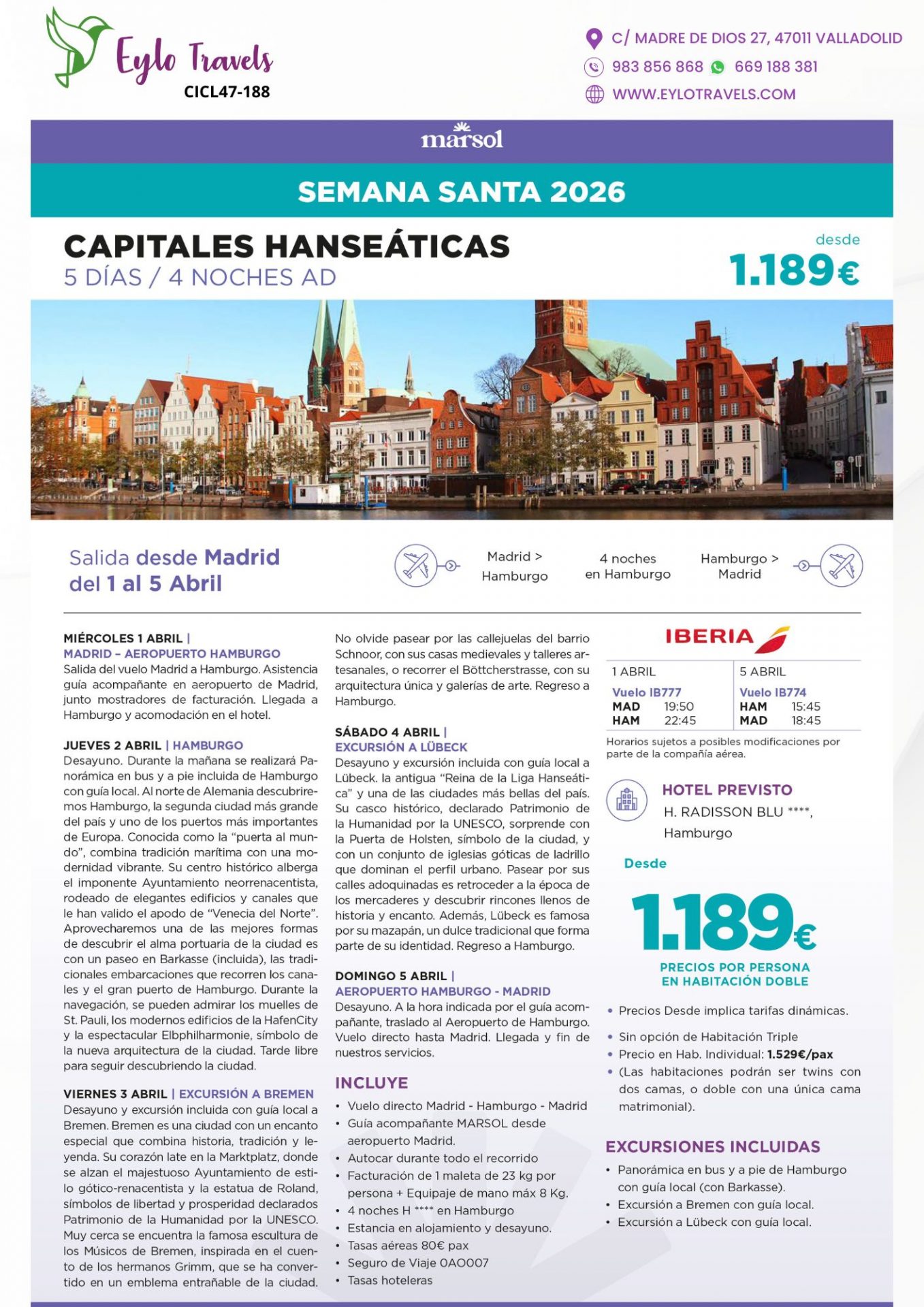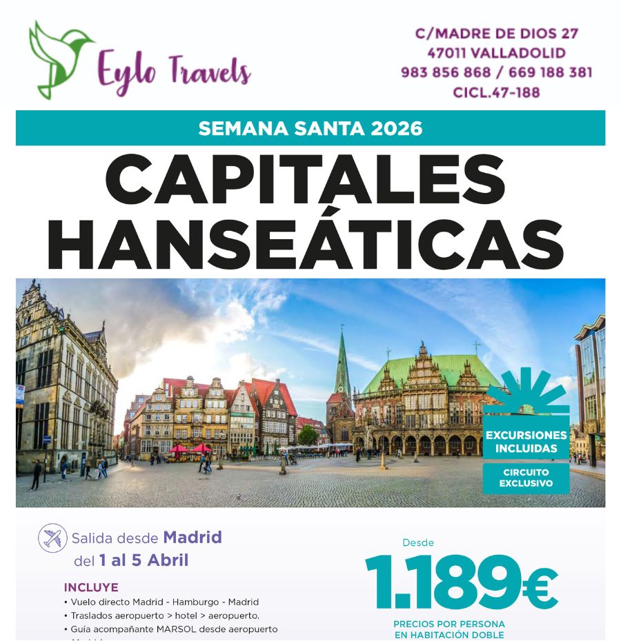 - Excursiones incluidas: Panorámica de Hamburgo (a pie y en Barkasse), excursión a Bremen con guía local, y excursión a Lübeck con guía local.