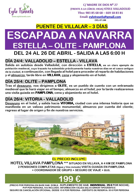 Salida a las 6:00 h. desde Valladolid. Nuestro primer destino es Estella, la «Toledo del Norte», una ciudad medieval cuyo trazado se ha conservado hasta nuestros días. Disfrutarás de tiempo libre para explorar su valioso casco antiguo y monumentos románicos como la Iglesia de San Pedro de la Rúa. A continuación llegada al Hotel Villava Pamplona*, para el reparto de habitaciones y almuerzo. Tarde libre en Villava, cena y alojamiento en el hotel. - 25/04/2026 – Olite – Pamplona (Castillo y Murallas)