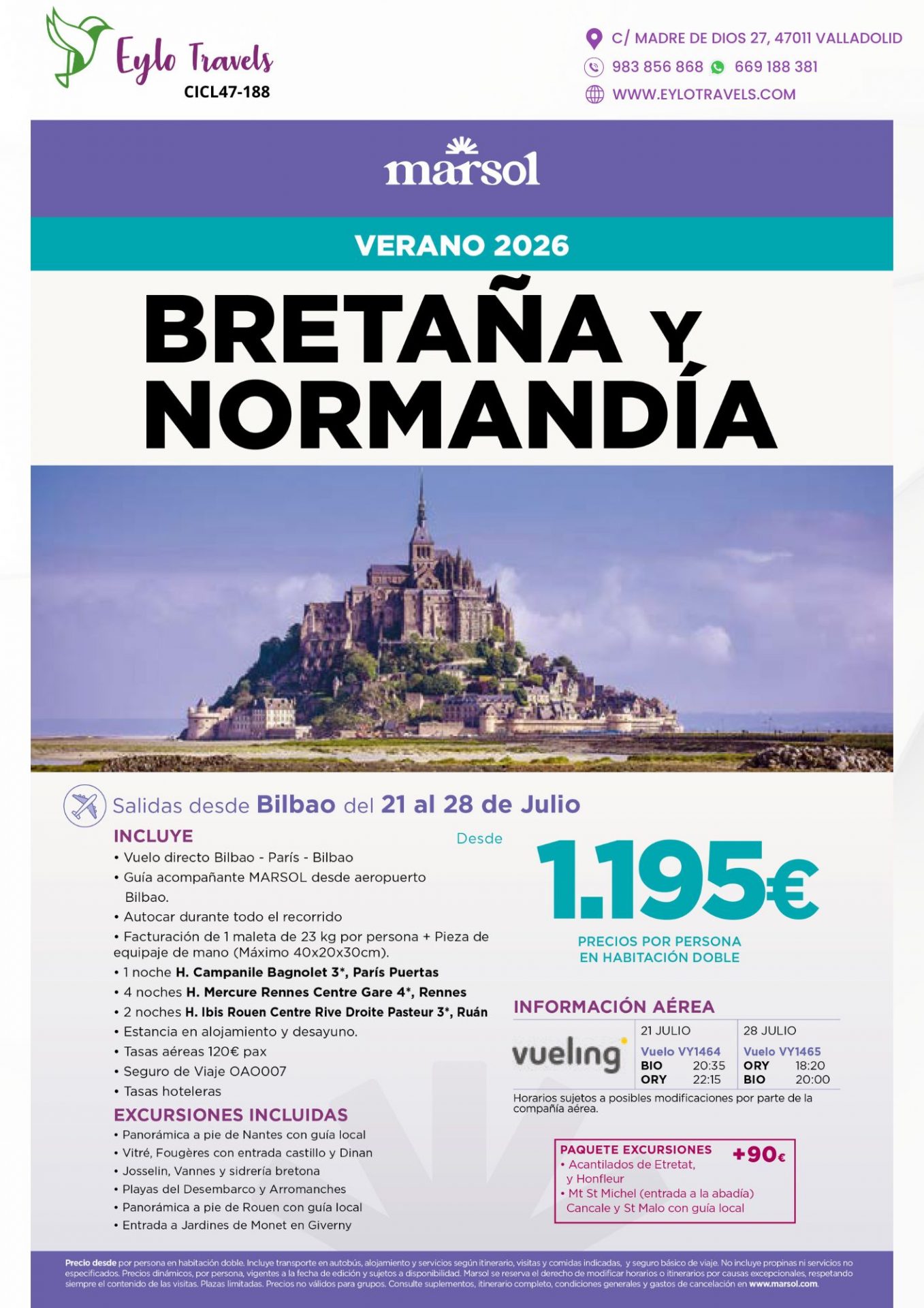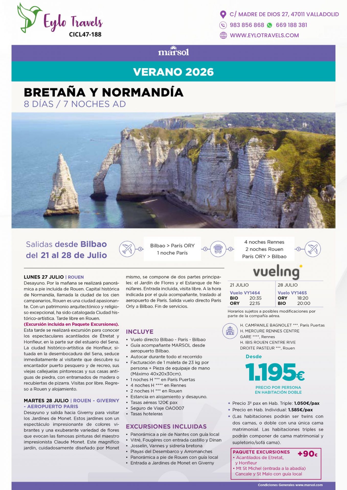 - Precio desde: 1195€ por persona en habitación doble. 1585€ por persona en habitación individual. Tercera persona en habitación triple 1050€.