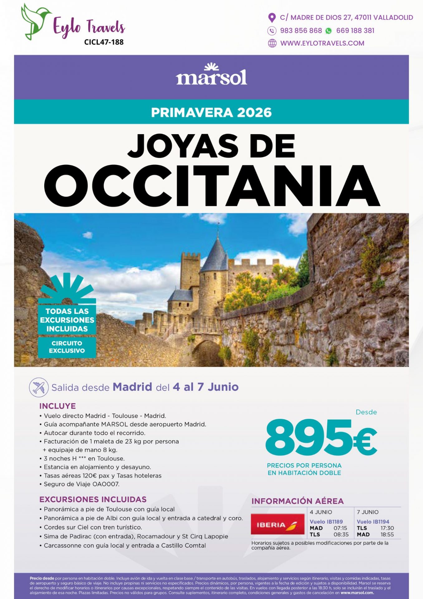 - 07-06-2026: Carcassonne – Madrid. Antes de volver, exploraremos la ciudadela medieval más impresionante de Europa: Carcassonne, con entrada incluida al Castillo Comtal.