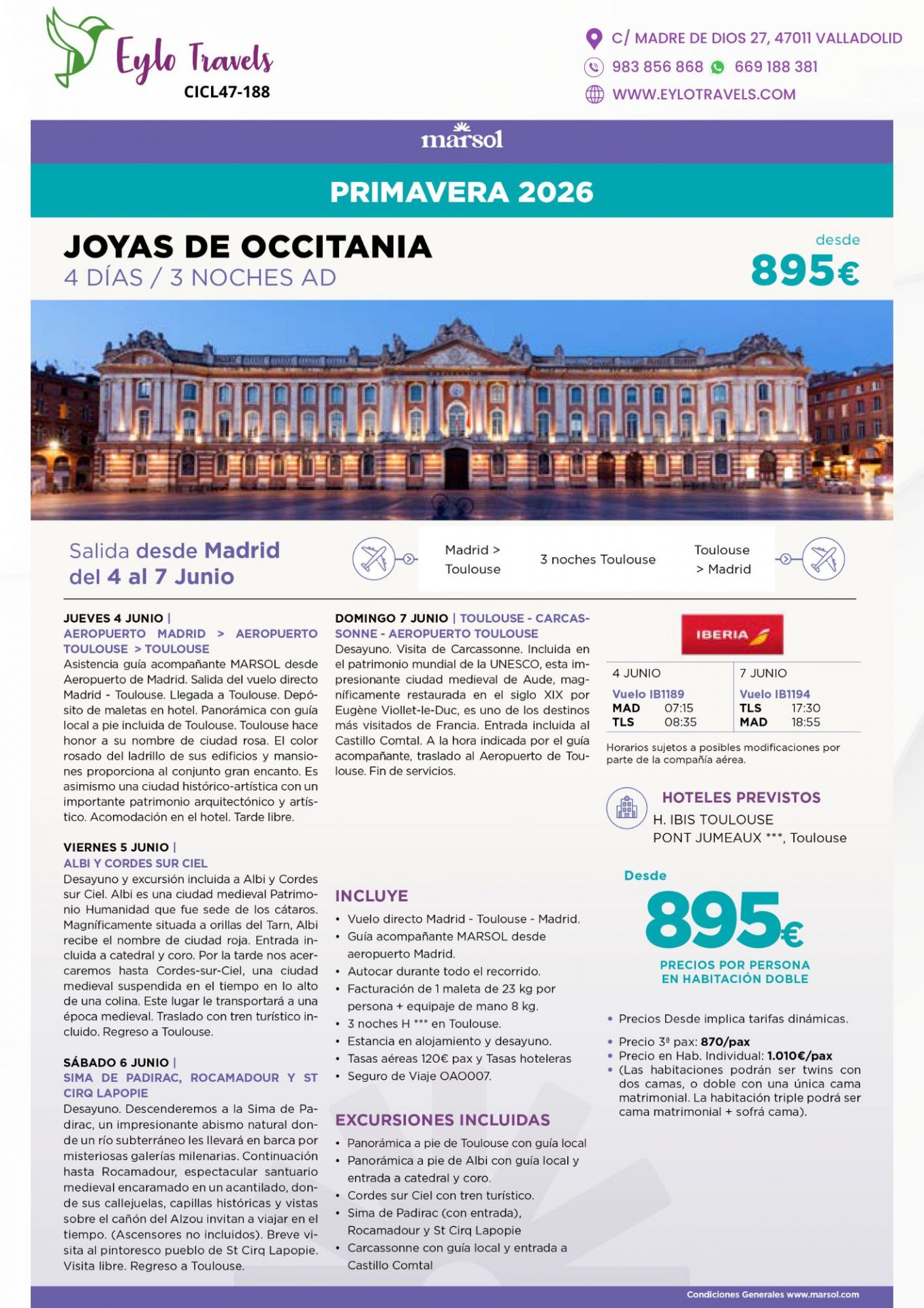 - 04-06-2026: Madrid – Toulouse. Comienza tu aventura con un vuelo directo. Disfruta de una visita panorámica a pie por Toulouse y descubre por qué sus edificios de ladrillo rosado enamoran a todo el que la visita.