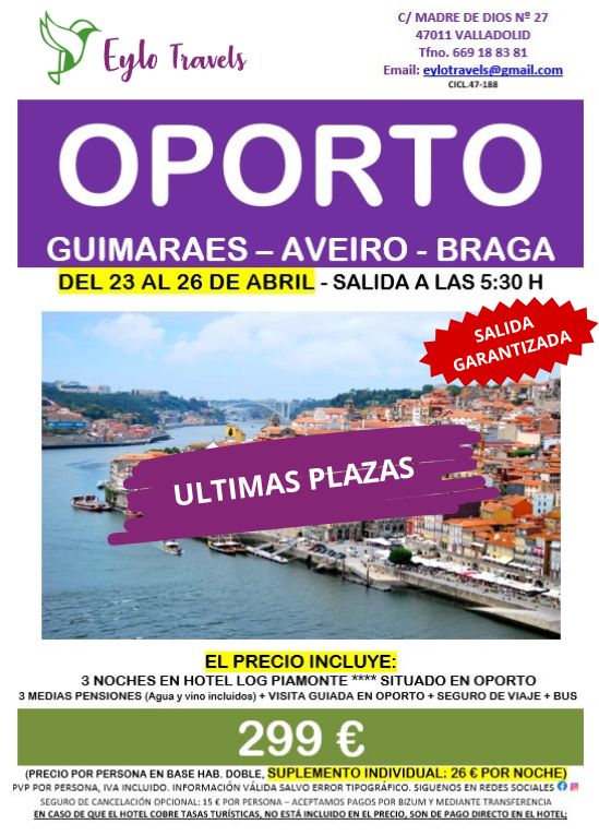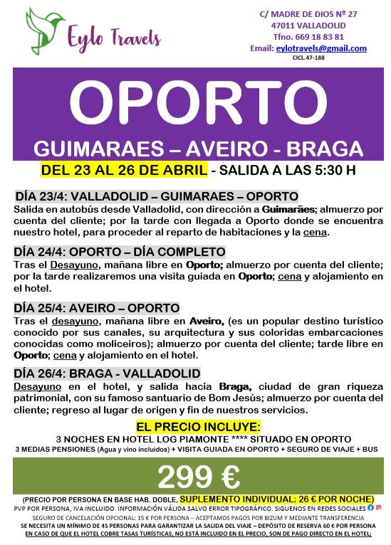 - Guía y Transporte: Autobús desde Valladolid y visita guiada oficial en Oporto.